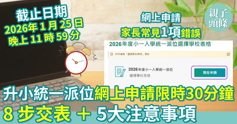 小一統一派位將於2026年1月19日至25日進行選校手續。已登記成為「小一入學電子平台」用戶並以「智方便+」綁定帳戶的家長可透過電子平台遞交統一派位「選擇學校表格」。家長必須注意,每次登入後的使用時間為30分鐘,如有需要,家長可以善用「儲存為草稿」功能。如選擇親身遞交,家長可按選校通知書上的指定時段前往指定統一派位中心辦理。1 day ago