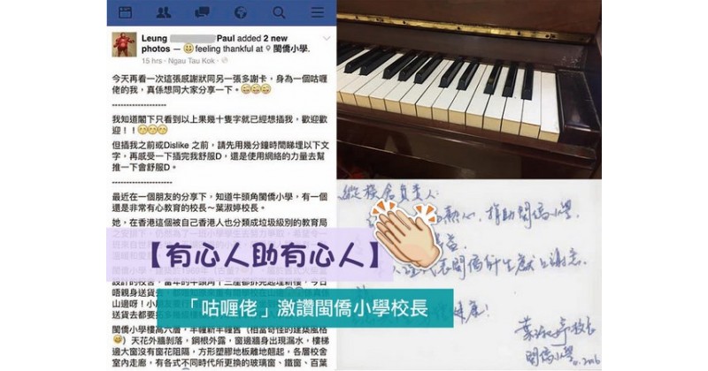 這位梁先生指,最近從朋友口中,得知這所位於牛頭角的小學,當中有一位非常有心教育的校長─葉淑婷。而「咕喱佬」更分享兩張相片,其中一張是感謝狀,另一長則是校長親筆寫的多謝卡,原來是他捐助物資予學校,得到校長的回覆,這位梁先生一再看這張感謝狀及多謝卡,因此希望與大家分享這個故事。 全文如下: 今天再看一次這張感謝狀同另一張多謝卡,身為一個咕喱...9 year ago